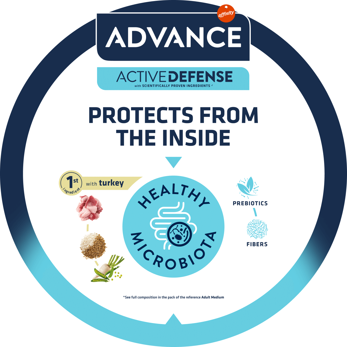 Our ACTIVE DEFENSE recipe helps your dog’s defences, thanks to its scientifically proven ingredients: probiotics, prebiotics, fibre and immunoglobulins, which will help its gut microbiota to be healthy.