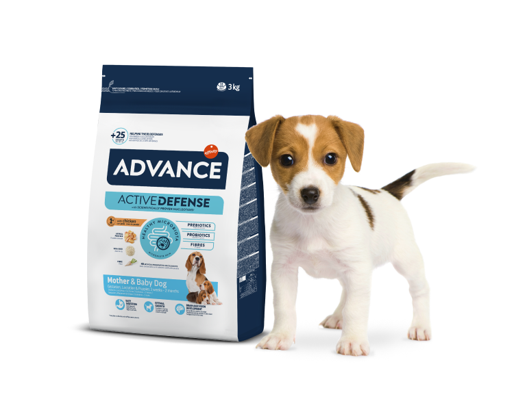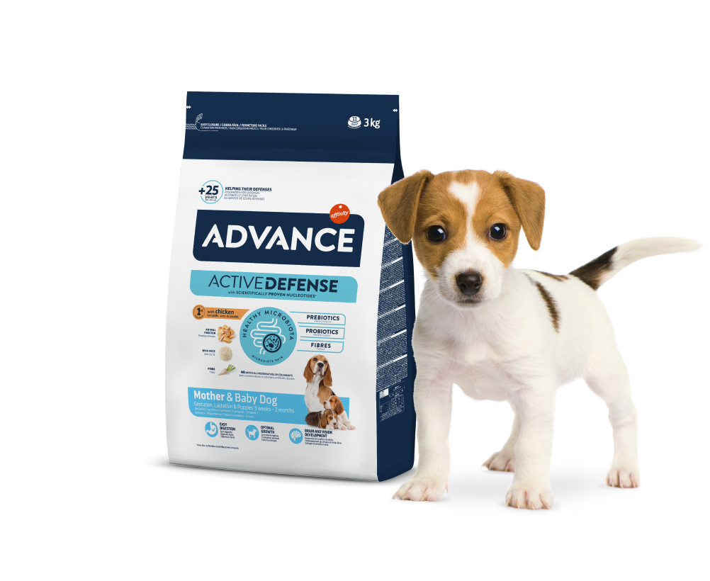 Comença el deslletament! Deixa-li unes croquetes ADVANCE Mother & Dog Initial humitejades amb un poc d'aigua tèbia com a suplement a la llet materna.