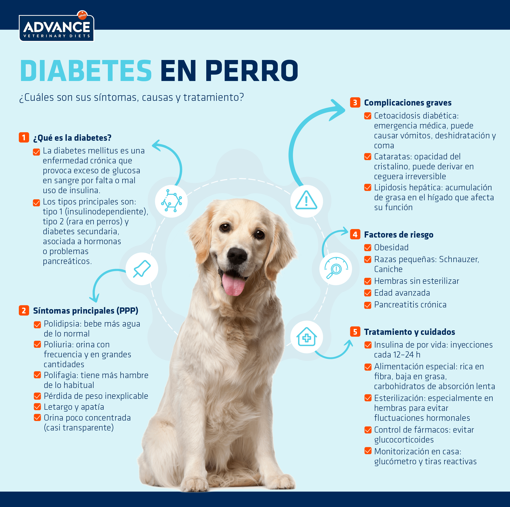 Para que el organismo de tu perro pueda utilizar la glucosa, su cuerpo necesita una hormona llamada insulina que permite que la glucosa de la sangre entre dentro de las células. Si esto no ocurre de manera natural, tu perro podría haber desarrollado diabetes. Hay diabetes de dos tipos: