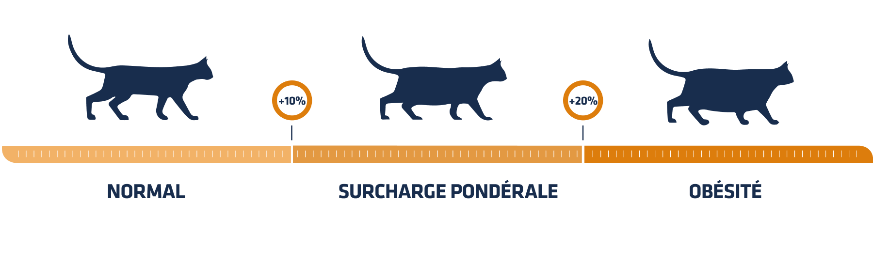 Lorsque votre chat se trouve au moins 10 % au-dessus de son poids idéal, il est en surcharge pondérale et s’il dépasse les 20 %, il se peut qu’il souffre même d’obésité.