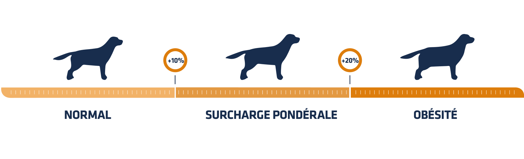 Lorsque votre chien se trouve au moins 10 % au-dessus de son poids idéal, il est en surcharge pondérale et s’il dépasse le 20 %, il se peut qu’il souffre même d’obésité.