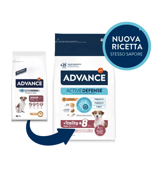 Advance Vitality Senior Mini +8 aiuta a mantenere la vitalità dei cani di piccola taglia di età superiore agli 8 anni. Apporta 7 benefici fondamentali per l’età che aiutano a mantenere la qualità della vita. È un alimento di facile digestione e la crocchetta si adatta alle dimensioni dei cani di piccola taglia.