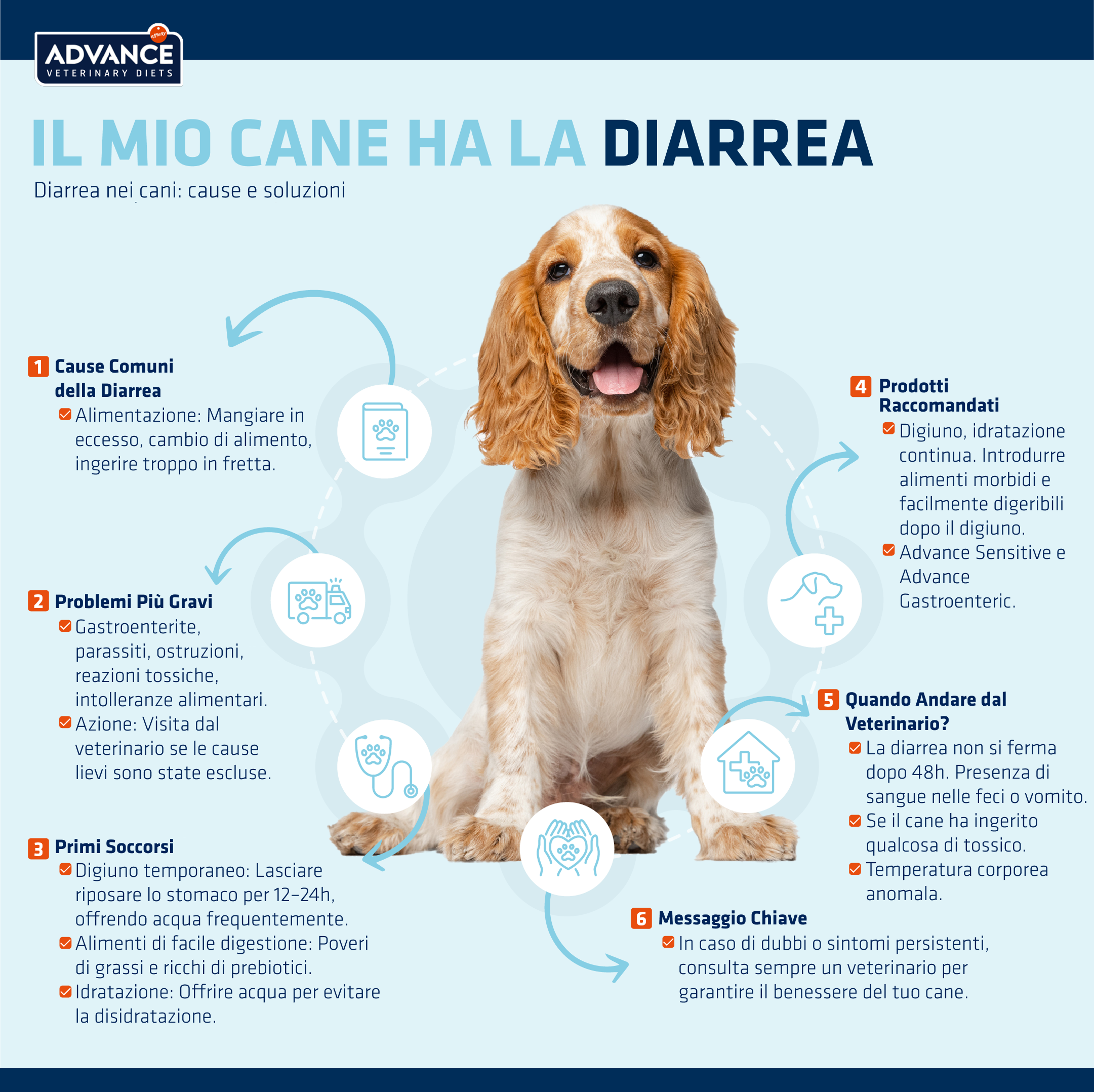 Una volta in ambulatorio, il veterinario farà un esame fisico completo. È importante che tu gli dica come si è presentata la diarrea, da quanto tempo ce l’ha o se sospetti che il tuo cane abbia mangiato qualcosa, come giocattoli, calze, spazzatura, ecc. A seconda della diagnosi, il veterinario può consigliare una dieta, come ADVANCE Gastroenteric, un trattamento o altre analisi come un esame del sangue, una radiografia dell'addome, un'ecografia, ecc.