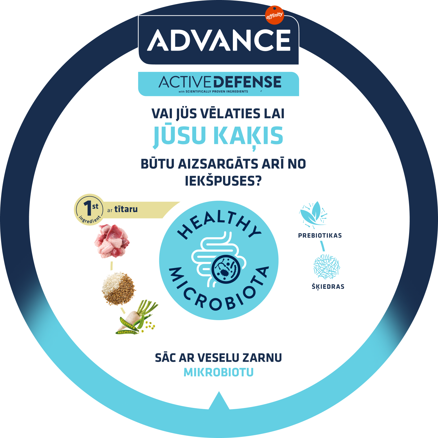 Tur dzīvo miljardiem dzīvu mikroorganismu (galvenokārt labvēlīgās baktērijas), veidojot zarnu mikrobiotu, kas ir pamats organisma aizsargbarjerai. Veselīgs zarnu mikrobiots palīdz stiprināt jūsu kaķa aizsargspējas un pasargā to no iekšpuses.