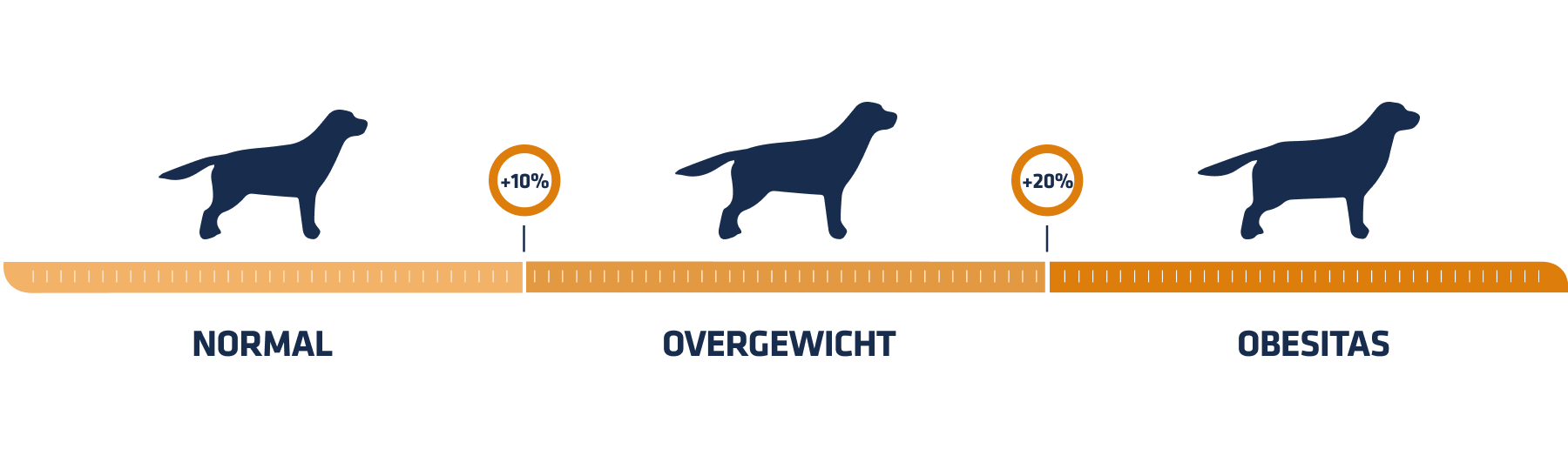 Wanneer een hond minstens 10% boven zijn ideale gewicht zit, is hij te zwaar. Is dit meer dan 20% dan kan hij zelfs zwaarlijvig zijn.