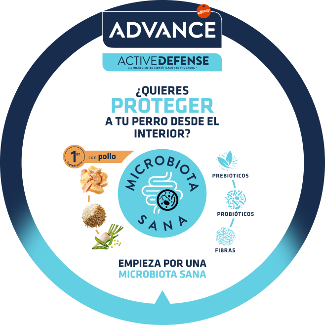 Nuestra receta ACTIVE DEFENSE ayuda a las defensas de tu perro gracias a sus ingredientes científicamente probados: probióticos, prebióticos, fibras e inmunoglobulinas, que ayudarán a que su microbiota esté sana.